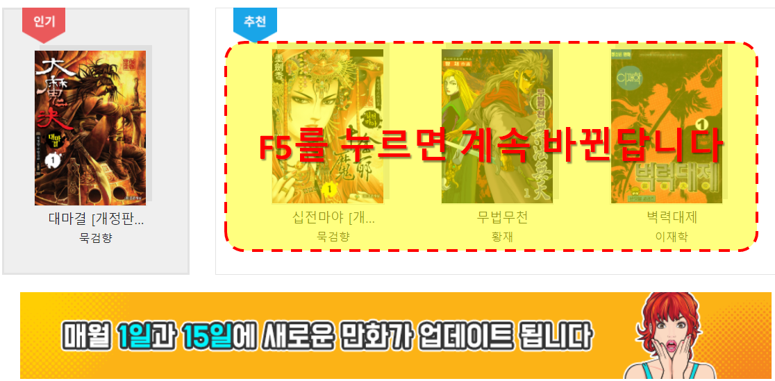 사용자에게 선택권을 주기 보다는 그냥 추천을 해 주는 방식 입니다. 오늘의 만화를 선택하거나 추천만화를 선택해서 볼 수 있습니다. 특이한 점은 추천만화를 선택해서 보다가 중간에 빠져 나오는 경우 해당 만화를 다시 찾기가 쉽지 않습니다. 찾는 방법은 사이트를 여러번 새로고침(F5) 하다보면 보고있던 추천만화가 나온다는 사실!