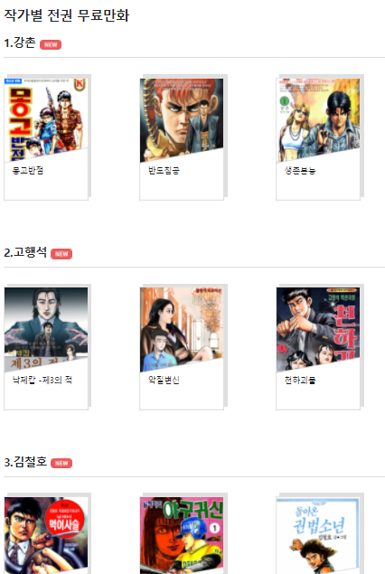 아래쪽을 살펴보면 작가별로 전권을 무료로 볼 수 있도록 정리가 되어 있습니다.